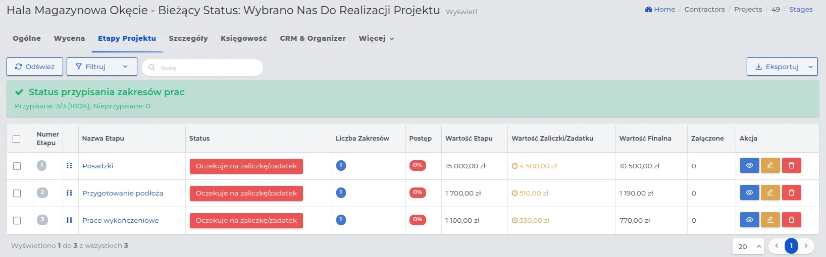 Based on the created list of stages with specified deposits or advances, the company can easily settle the project in stages. Each stage constitutes a separate settlement point – the client pays part of the amount before the work begins and the remaining part after its completion. This solution facilitates control over cash flow, ensures financial liquidity, and organizes the invoicing process.