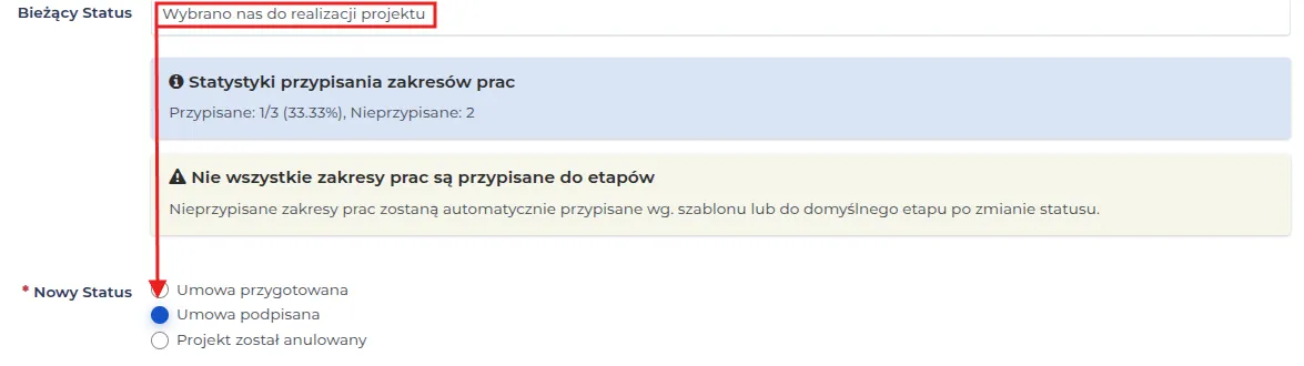 REMEMBER: When changing the status to the next one after “We were chosen to execute the project”, the system automatically checks and displays the status of the assigned work scopes in the stages.