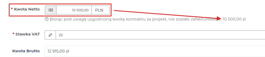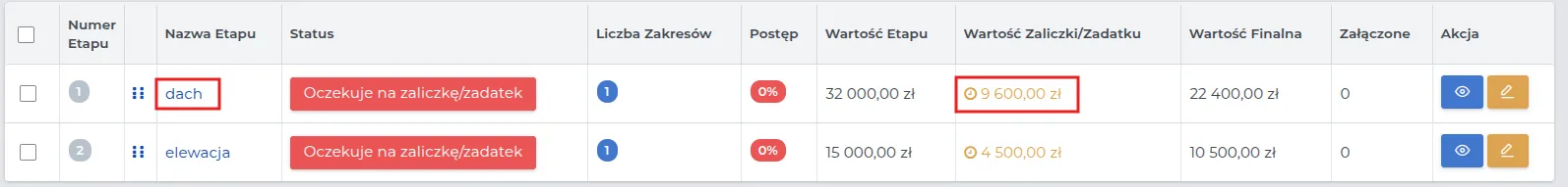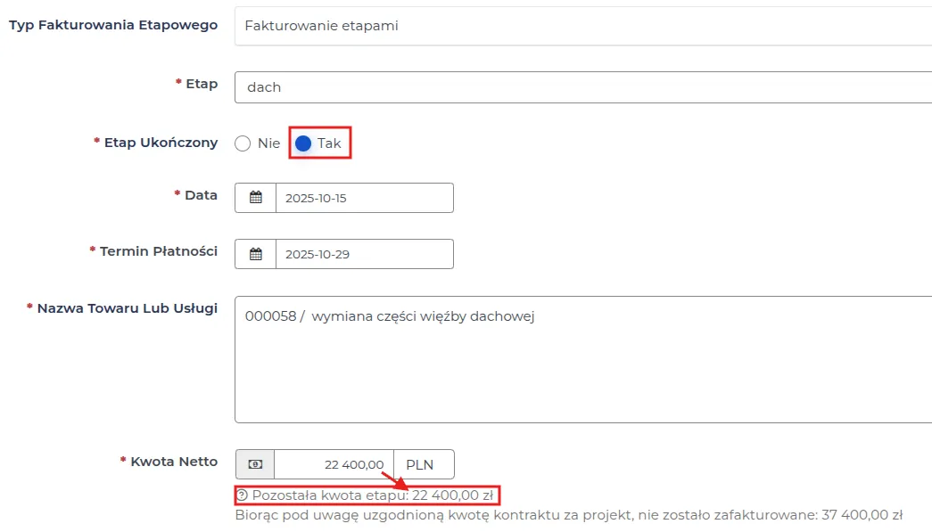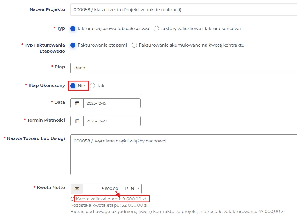 REMEMBER: First, enter the advance or deposit calculated when creating the stages, and after the stage is completed, issue an invoice for the remaining amount assigned to that stage.