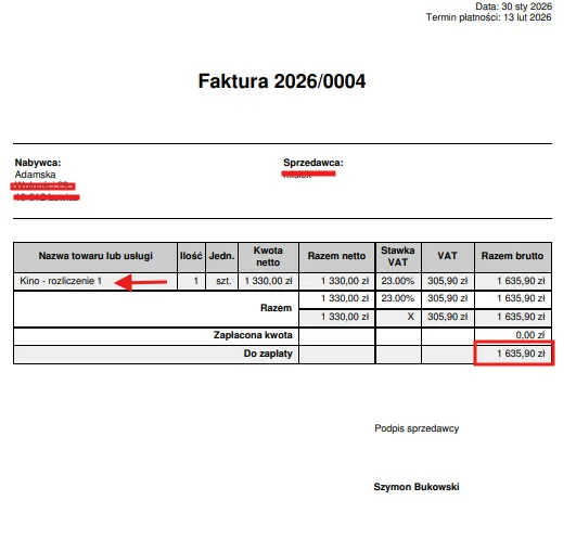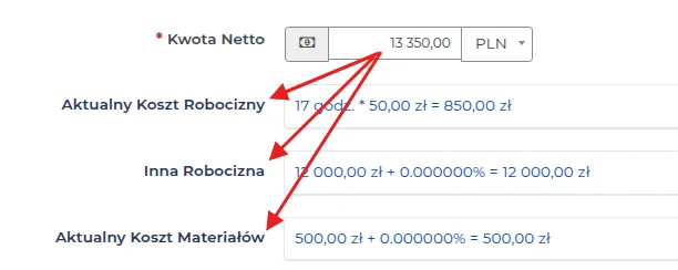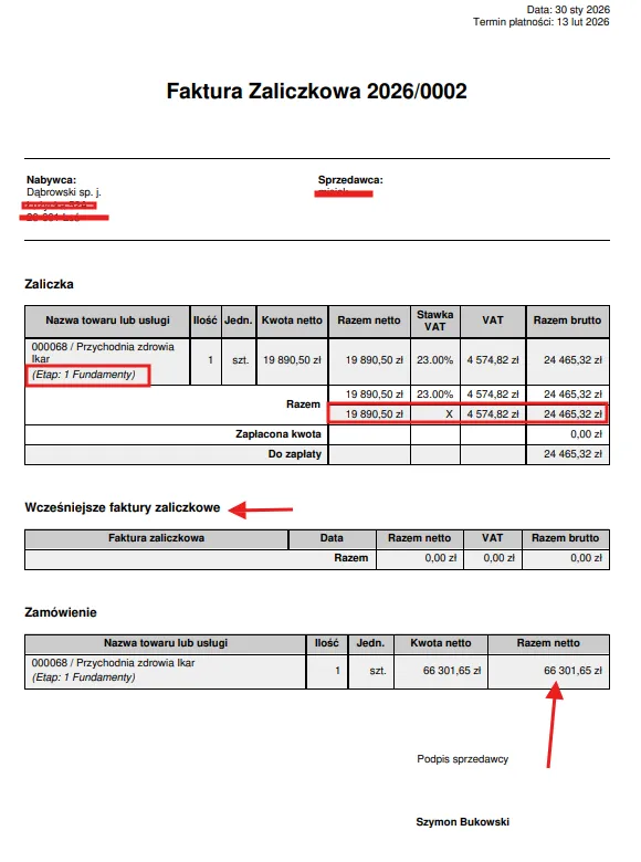 REMEMBER: For the next invoice after completing the work for a given stage, the system will automatically fill in the “Net amount” field with the amount that is the difference between the advance and the total value of the stage. The system will suggest the amount remaining to be settled.