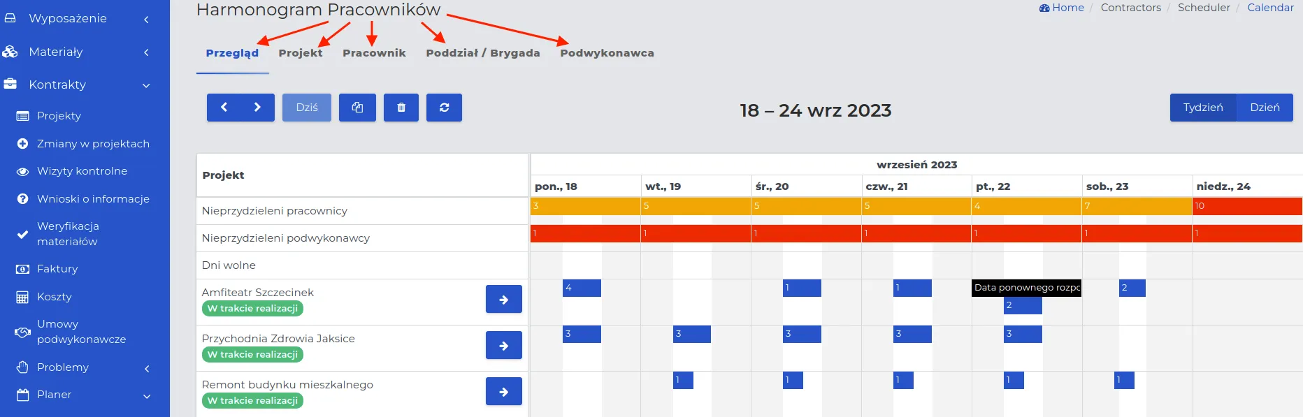 Regardless of the number of ongoing projects, the Contractors.es system allows you to register a work plan for each of them. The graphical representation of the planner in a tabular form is clear and transparent. The Planner module is divided into categories related to the projects themselves or directly related to the employees assigned to a selected construction site.