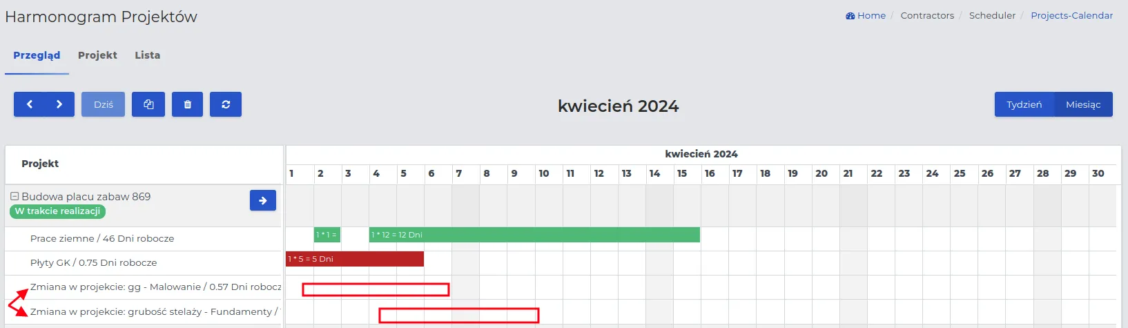 Section titled “Editing Project Schedules”Moving events in the table allows you to control the stages of work and fill in free slots with those scopes of work that do not conflict with currently ongoing tasks.