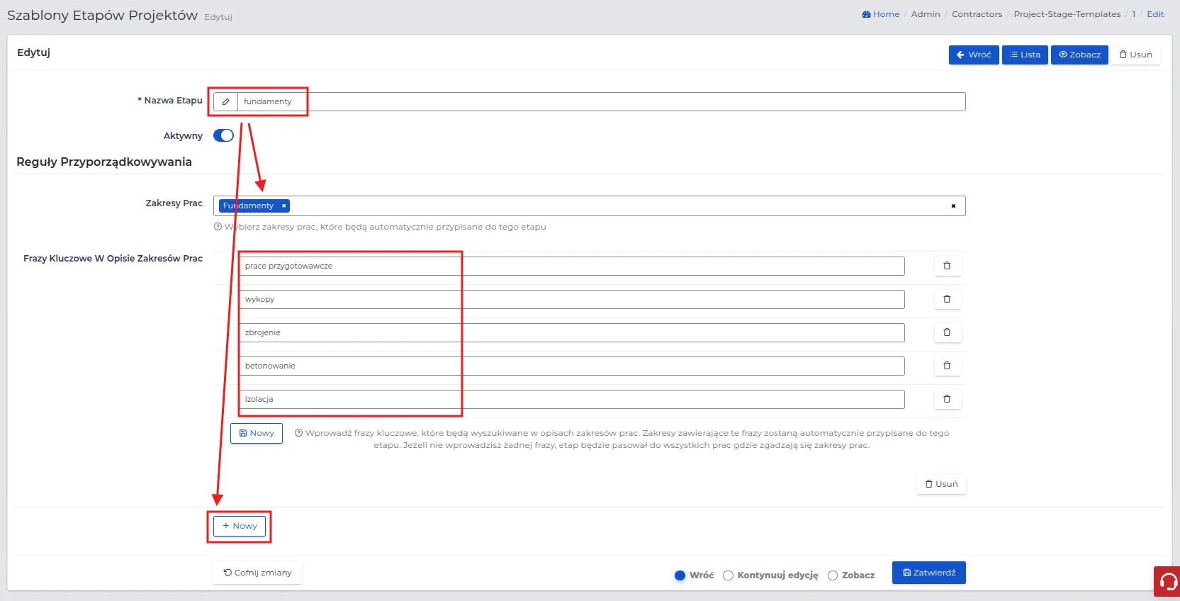UWAGA: Etap Fundamenty można podzielić na dwa lub więcej zakresów prac o tej samej nazwie, wpisując jednak oddzielnie frazy kluczowe dla każdego z nich. Dzięki temu system będzie automatycznie przypisywał odpowiednie zadania do właściwego podetapu.