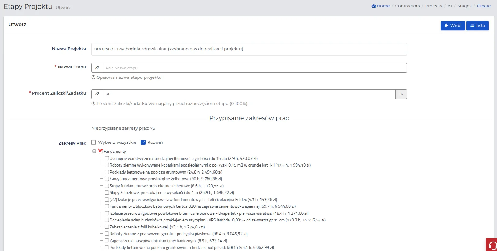 Na liście pojawią się wszystkie etapy utworzone zgodnie z wprowadzonymi zakresami prac oraz szablonem etapów.