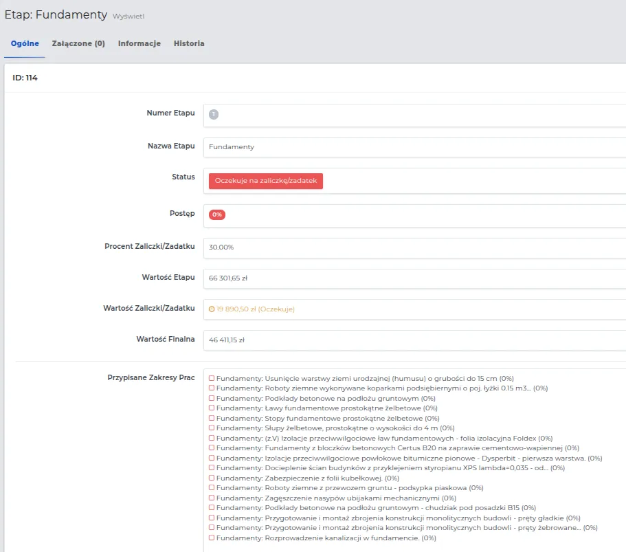 - Nazwa etapu: Określenie, po którym można rozpoznać zakresy prac wchodzące w skład danej grupy, np. Fundamenty.