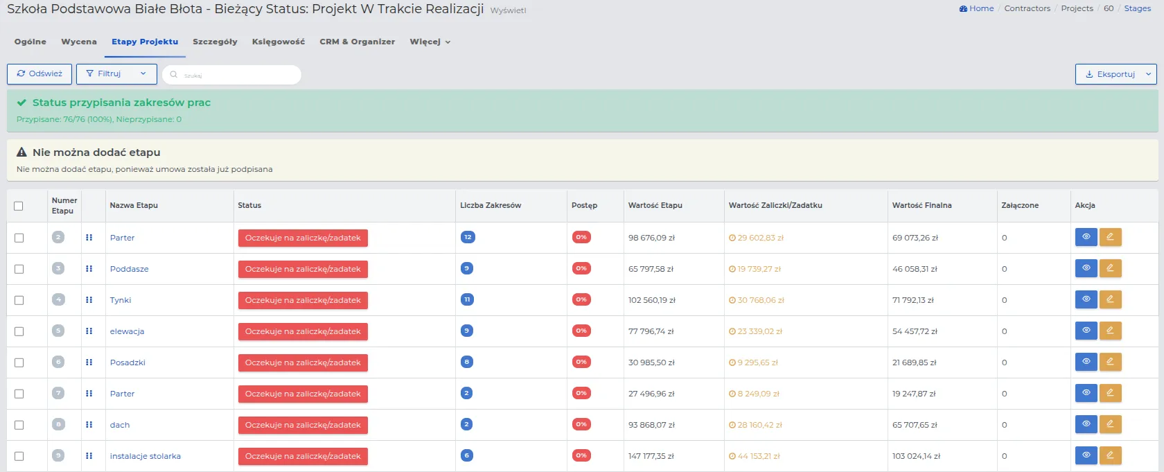 UWAGA: Nie można dodawać ani usuwać etapów w projektach już rozpoczętych lub z podpisaną umową.