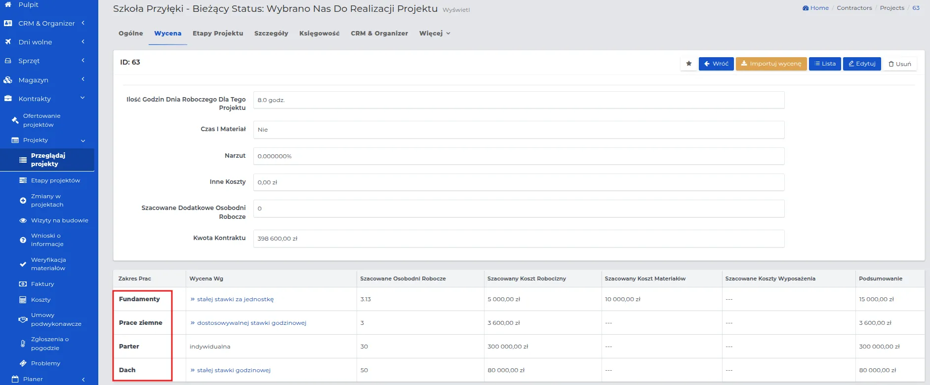 W naszym przykładzie zakresy prac obejmują: Prace ziemne, Fundamenty, Parter, Dach.