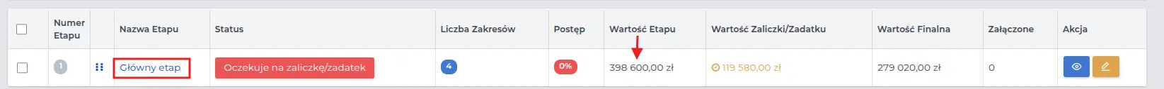 PAMIĘTAJ: System przypisuje typy zadań do konkretnych etapów projektu. Dzięki temu harmonogram zachowuje porządek i spójność. Jeśli wszystkie zakresy prac są w jednym etapie, np. „Głównym”, można swobodnie przełączać się między typami zadań.