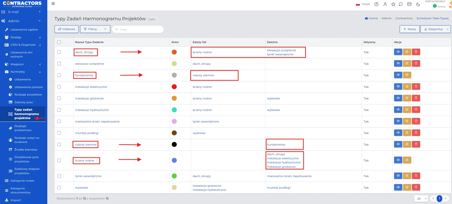 PAMIĘTAJ: Jeśli jeden typ prac jest zależny od innego (np. wylewka musi wyschnąć przed ułożeniem płytek) oraz utworzono prawidłowy harmonogram projektów z zależnościami oraz opóźnieniami, to system uwzględni tę zależność podczas planowania kolejnych prac poprzez informowanie w odpowiednich dniach konieczności przydzielenia ekip.