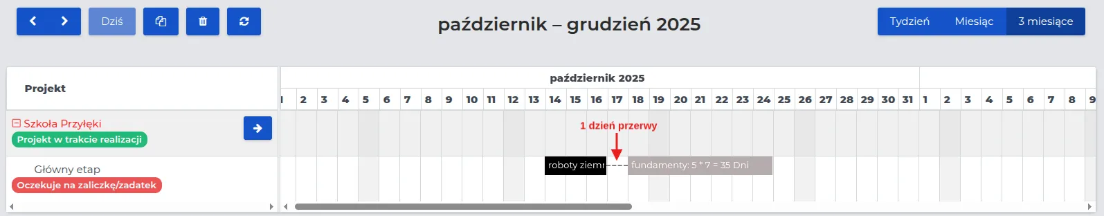 UWAGA: Niezależnie od terminu wpisanego w kalendarzu, system automatycznie uwzględni jednodniową przerwę, pozostawiając wolne miejsce w planerze przed rozpoczęciem kolejnego etapu.